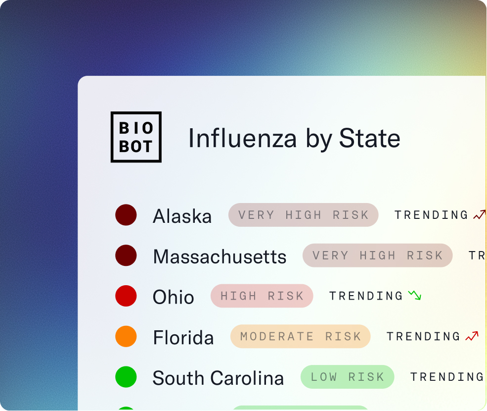 Visualize risk levels for every state and county to identify where pathogen activity is rising, stable, or declining—empowering agencies to coordinate surveillance and response across the country.