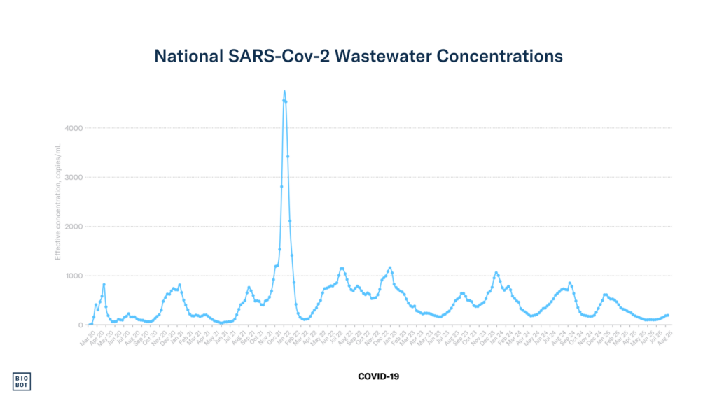 We continue to monitor the evolving H5N1 influenza virus situation, and can now test samples specifically for H5 (including H5N1) — see our blog here and please reach out to hello@biobot.io if interested. A quick reminder that Biobot’s influenza A assay described in this report includes the H5N1 influenza subtype, which is an influenza A virus, but does not distinguish between the different subtypes of influenza A (e.g. H5N1 vs H1N1). We will share any important updates as we have them via Bluesky and in the risk reports.