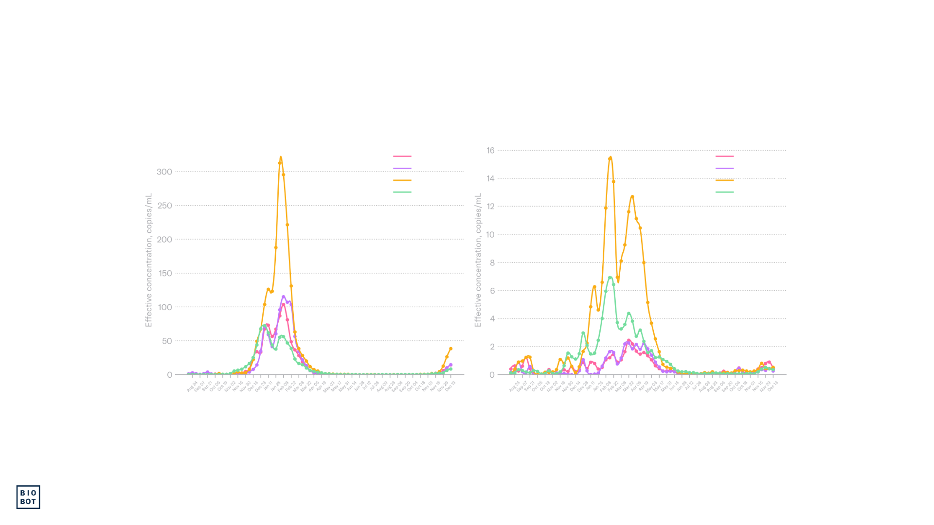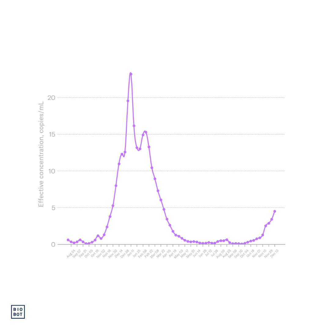 We continue to monitor the evolving H5N1 influenza virus situation, and can now test samples specifically for H5 (including H5N1) — see our blog here and please reach out to hello@biobot.io if interested. A quick reminder that Biobot’s influenza A assay described in this report includes the H5N1 influenza subtype, which is an influenza A virus, but does not distinguish between the different subtypes of influenza A (e.g. H5N1 vs H1N1). We will share any important updates as we have them via Bluesky and in the risk reports. Wastewater data from Biobot Analytics for RSV, influenza, and SARS-CoV-2 are through December 13, 2025 (MMWR week 50). Clinical data for RSV, influenza, and COVID-19 from the Centers for Disease Control and Prevention are through December 6, 2025 (MMWR week 49).
