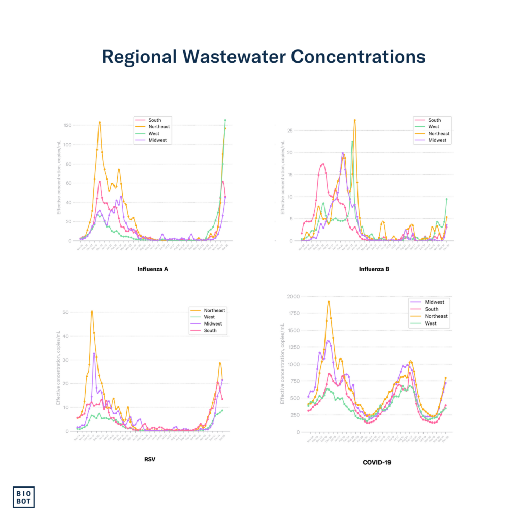 Biobot’s national wastewater network shows that SARS-CoV-2 and influenza A & B continue to increase, while RSV has started decreasing in week 52 (through December 28, 2024). National hospitalizations for COVID-19 and RSV are holding steady, currently at 2.3 and 2.7 per 100,000 people in week 51 (through December 21, 2024), respectively. National hospitalizations for influenza continue to increase and are the highest compared to the other respiratory viruses, currently at 3.5 per 100,000 people.