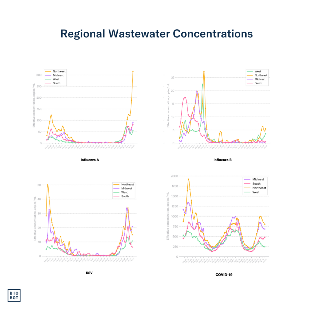 Biobot’s national wastewater network shows that influenza A & B continue to increase, while COVID-19 holds steady and RSV decreases in week 5 (through February 1, 2025). National hospitalizations for influenza are the highest compared to the other respiratory viruses and are holding steady, currently at 8 per 100,000 people in week 4 (through January 25, 2025). This season’s flu hospitalizations are the highest we’ve seen in the previous 6 years. National hospitalizations for COVID-19 and RSV decreased in week 4, currently at 2 and 2.1 per 100,000 people, respectively.