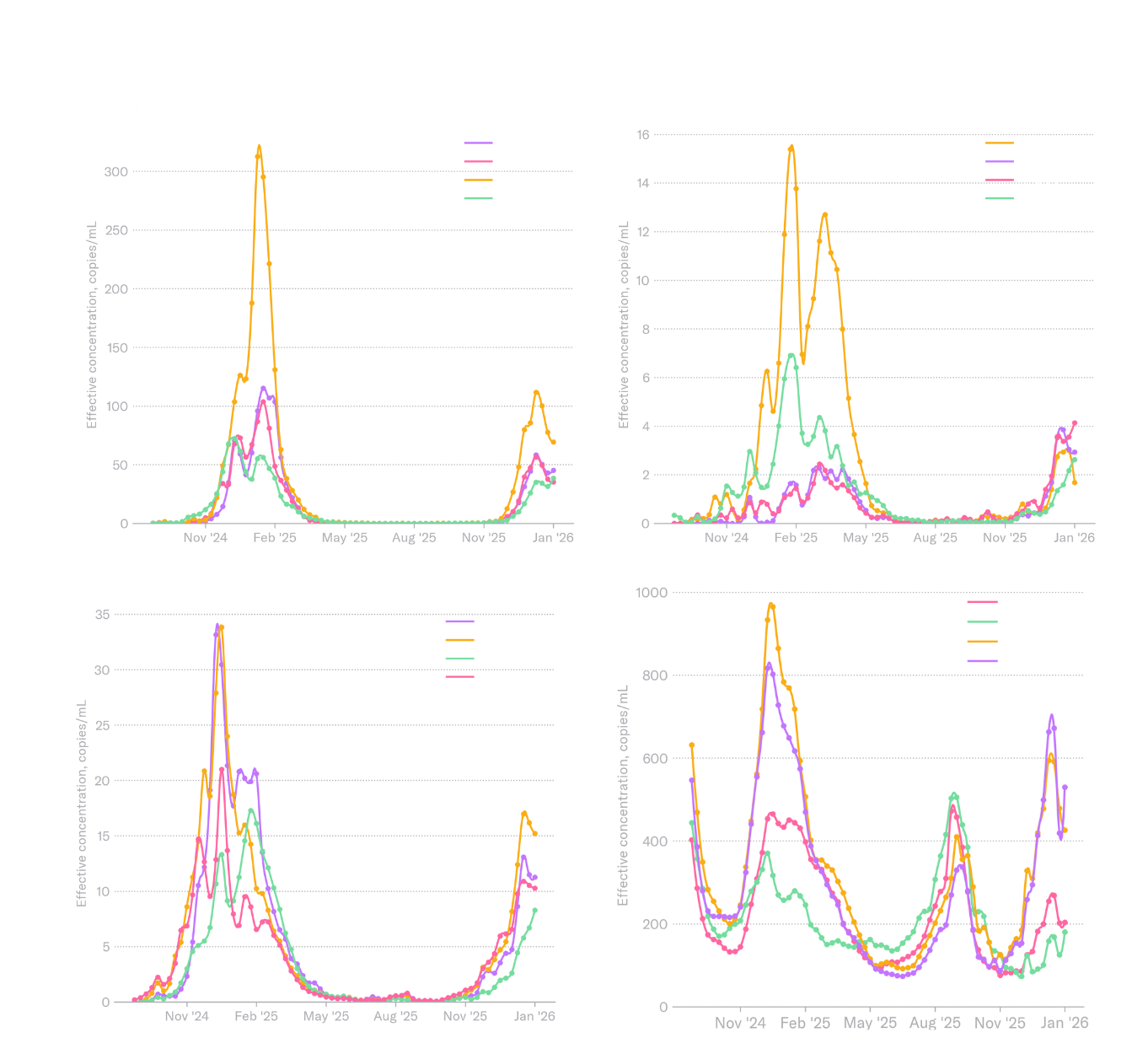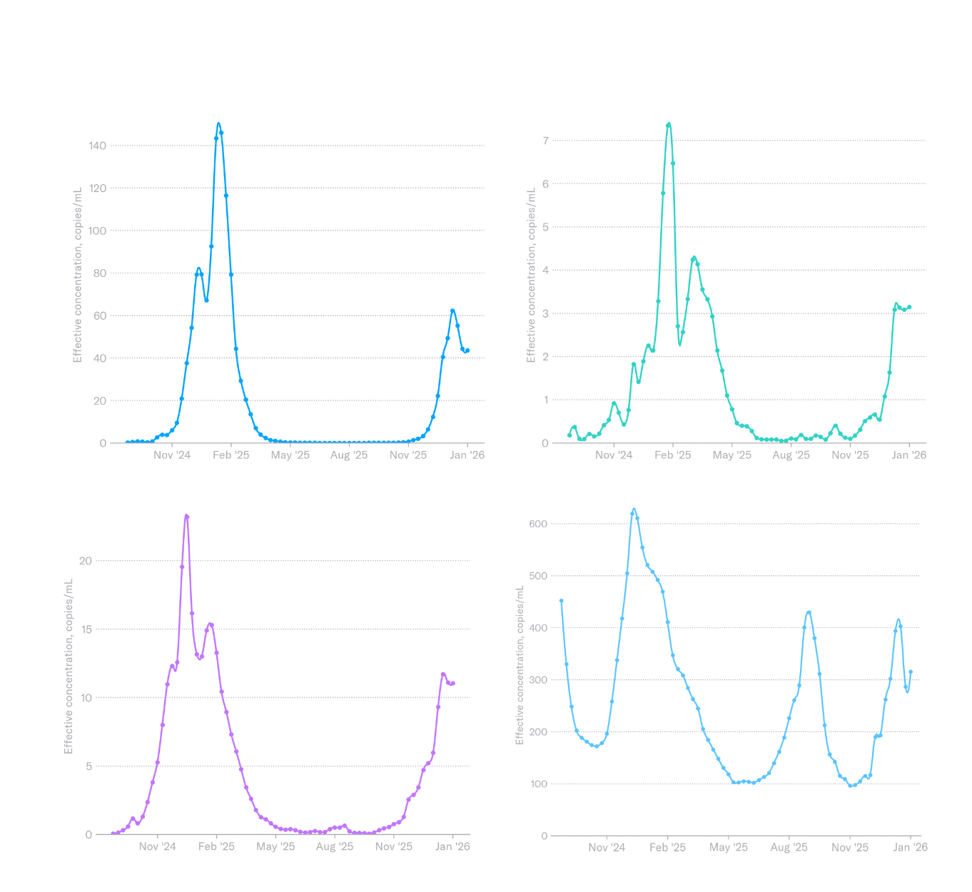 We continue to monitor the evolving H5N1 influenza virus situation, and can now test samples specifically for H5 (including H5N1) — see our blog here and please reach out to hello@biobot.io if interested. A quick reminder that Biobot’s influenza A assay described in this report includes the H5N1 influenza subtype, which is an influenza A virus, but does not distinguish between the different subtypes of influenza A (e.g. H5N1 vs H1N1). We will share any important updates as we have them. Wastewater data from Biobot Analytics for RSV, influenza, and SARS-CoV-2 are through January 24, 2026 (MMWR week 3).