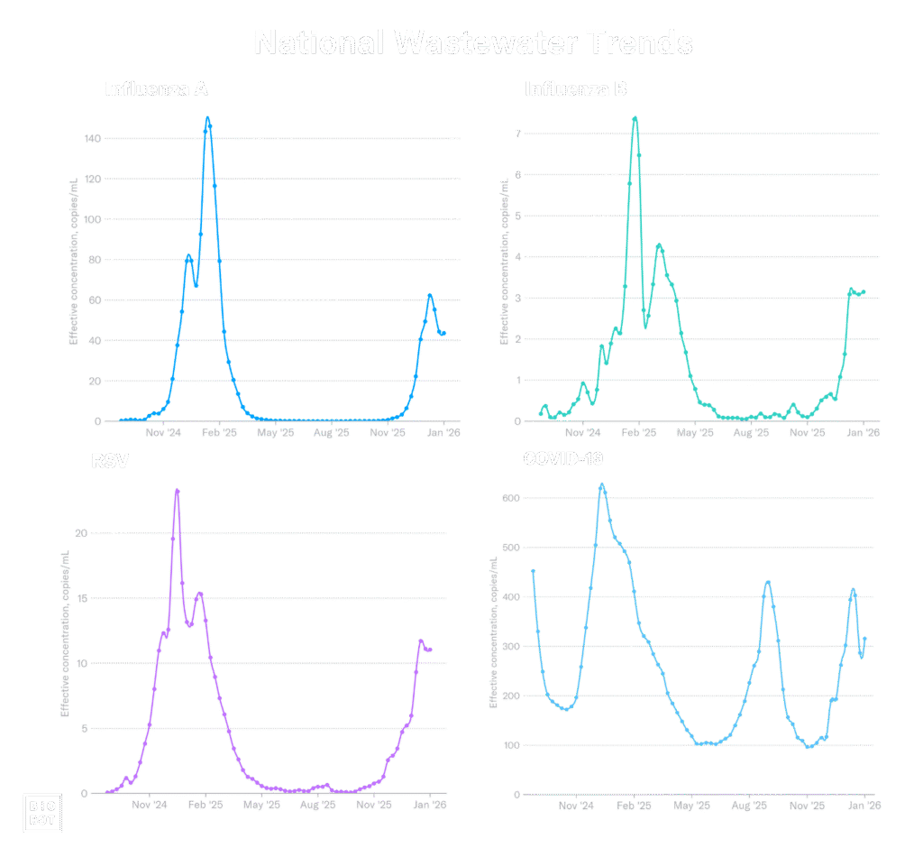 Biobot’s national wastewater data shows that respiratory virus trends are beginning to shift again. COVID-19 levels are rising again nationally—it’s not unusual for there to be fluctuations at this point in the season. Influenza and RSV remain steady nationally, but regional patterns are more mixed. In the South, RSV is decreasing while flu B is climbing. Meanwhile, the Midwest and West are seeing increases in COVID-19 and flu A.
