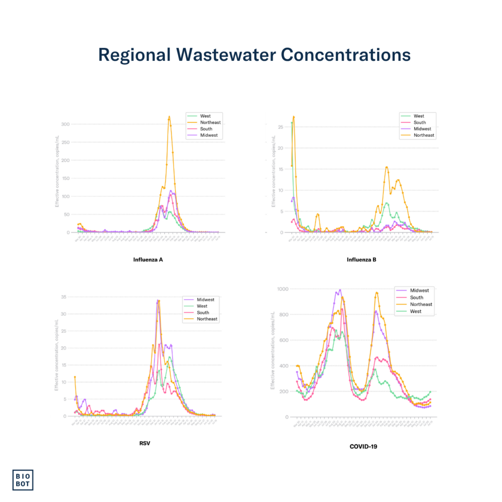 We continue to monitor the evolving H5N1 influenza virus situation, and can now test samples specifically for H5 (including H5N1) — see our blog here and please reach out to hello@biobot.io if interested. A quick reminder that Biobot’s influenza A assay described in this report includes the H5N1 influenza subtype, which is an influenza A virus, but does not distinguish between the different subtypes of influenza A (e.g. H5N1 vs H1N1). We will share any important updates as we have them via Bluesky and in the risk reports.