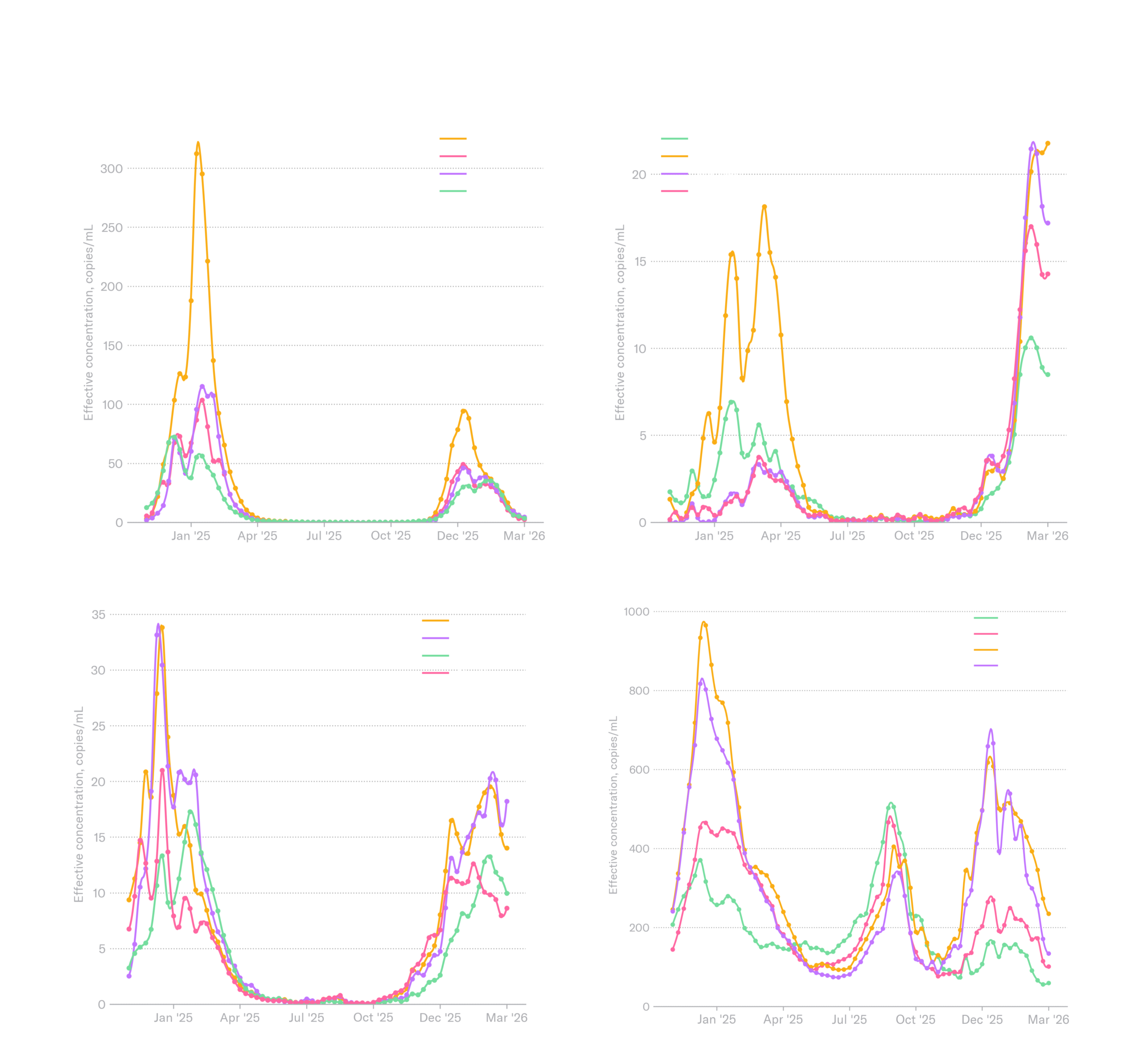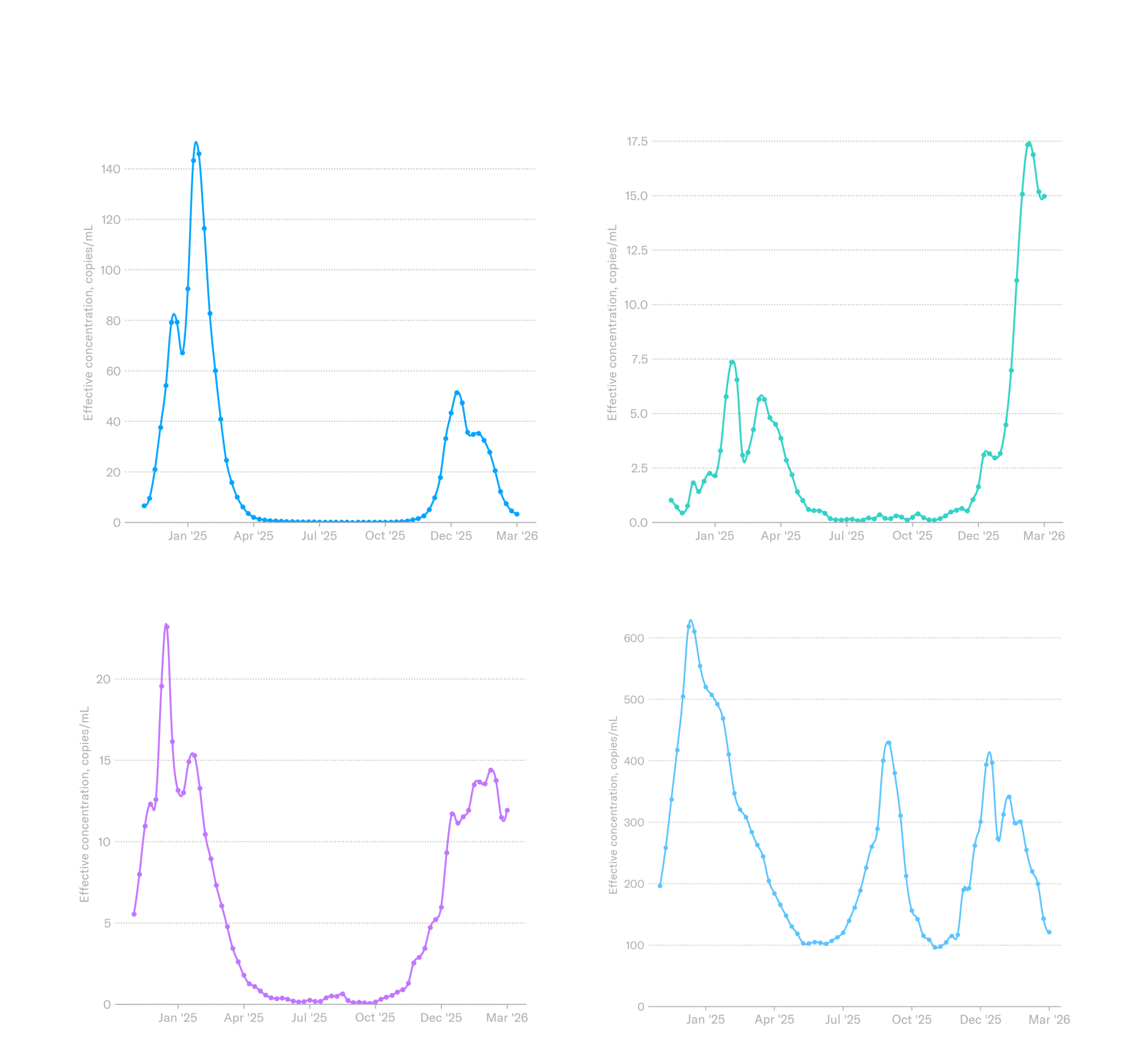 Biobot’s national network shows that SARS-CoV-2, influenza A, and influenza B are decreasing nationally, while RSV is increasing, driven by increases in the South and Midwest. This has been one of the longest RSV seasons in recent history, causing some states (like California) to extend the recommendation window for infant monoclonal antibodies into April. While we’re getting closer to the end of the respiratory season, it’s still hanging on.