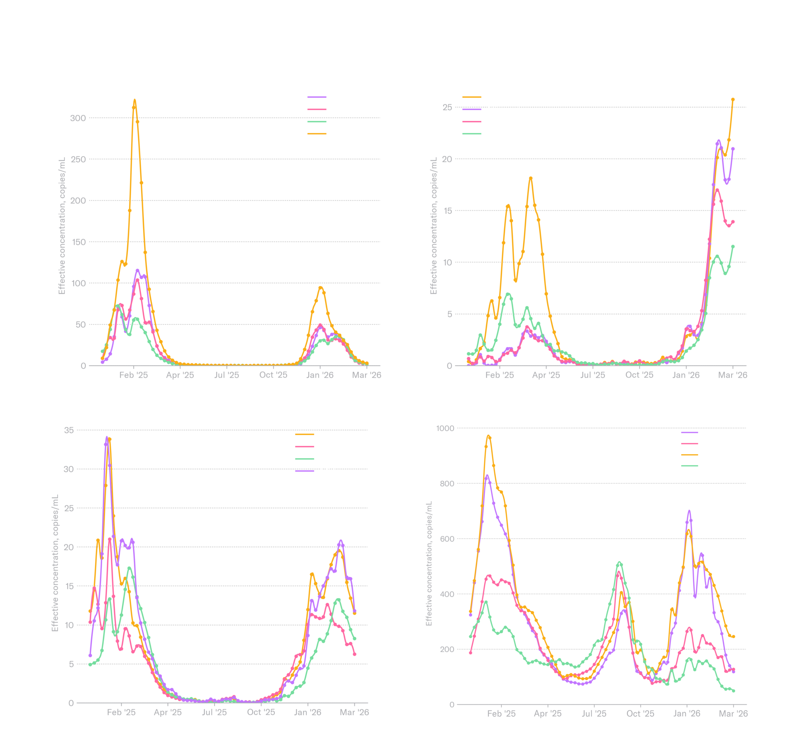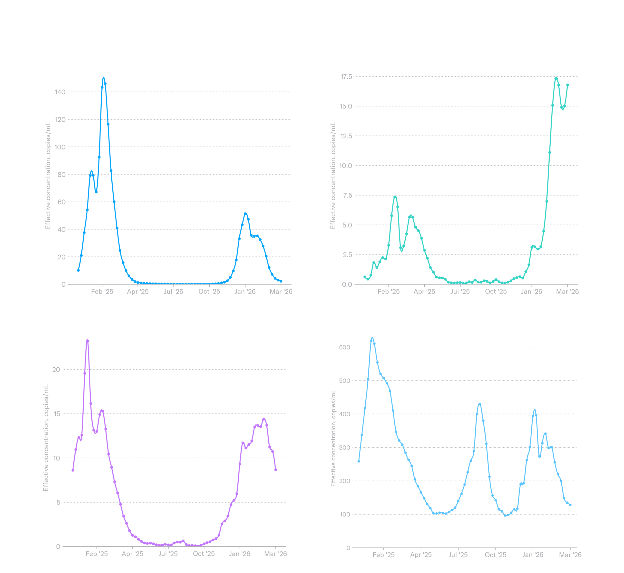 We continue to monitor the evolving H5N1 influenza virus situation, and can now test samples specifically for H5 (including H5N1) — please reach out to hello@biobot.io if interested. A quick reminder that Biobot’s influenza A assay described in this report includes the H5N1 influenza subtype, which is an influenza A virus, but does not distinguish between the different subtypes of influenza A (e.g. H5N1 vs H1N1). We will share any important updates as we have them.